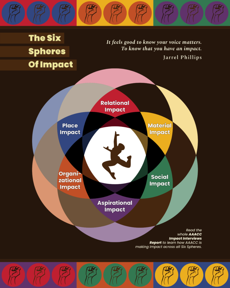 Working with Tree of Change, AAACC initiated a process to update our Mission, Vision, and Values. Efforts are organized around Six Spheres of Impact within which the AAACC’s support could be attributed. They are: Relational Impact, Material Impact, Social Impact, Aspirational Impact, Organizational Impact, and Place Impact. Each Sphere of Impact has parameters that define it, stories that articulate the shape of its impact, and maps that provide guideposts for future planning, iterative design, and culture tending.