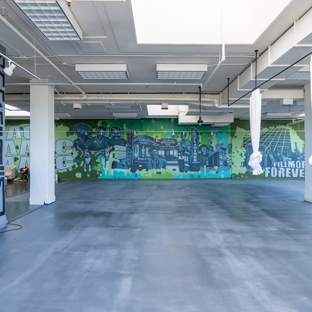 The Nia Room (760 sq. ft.), with wall-to-wall natural light, is primarily utilized for training sessions, photography sessions, film screenings, lectures, and classes.